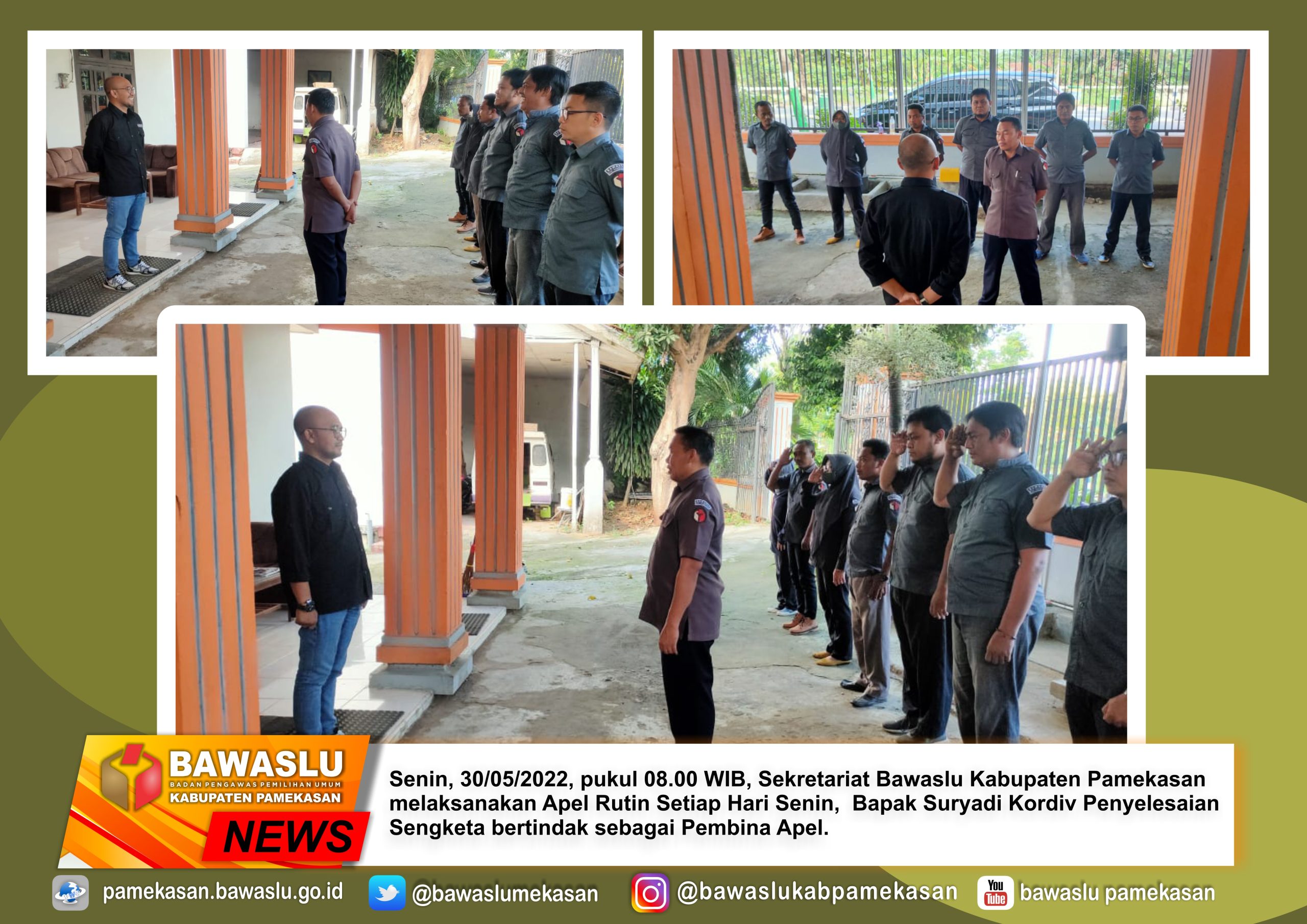 Pelaksanaan Apel pagi tanggal 30 Mei 2022 di ikuti oleh Koordinator sekretariat Bawaslu Kabupaten Pamekasan serta seluruh staf sekretariat Bawaslu Pamekasan, dan bertindak sebagai Pembina apel adalah bapak Suryadi yang merupakan anggota Bawaslu Pamekasan Koordinator Divisi Penyelesaian Sengketa.