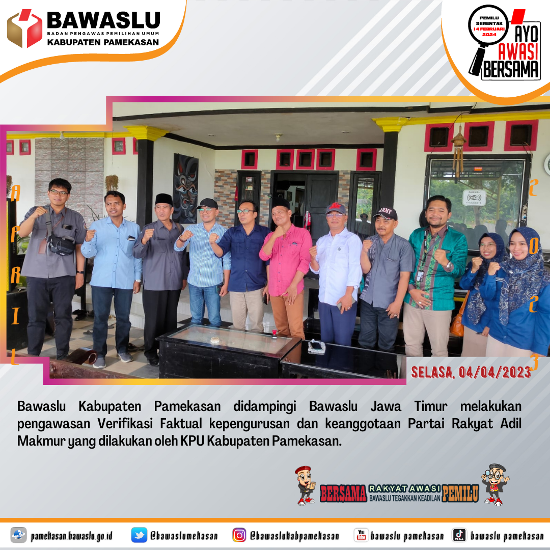 Badan Pengawas Pemilihan Umum Kabupaten Pamekasan – Pamekasan. Bawaslu Kabupaten Pamekasan didampingi Bawaslu Provinsi Jawa Timur melakukan pengawasan verifikasi Faktual kepengurusan dan keanggotaan Partai Rakyat Adil Makmur (PRIMA) yang dilakukan oleh KPU Kabupaten Pamekasan di Desa Jarin Kecamatan Pademawu.. Selasa, 04/04/2023.