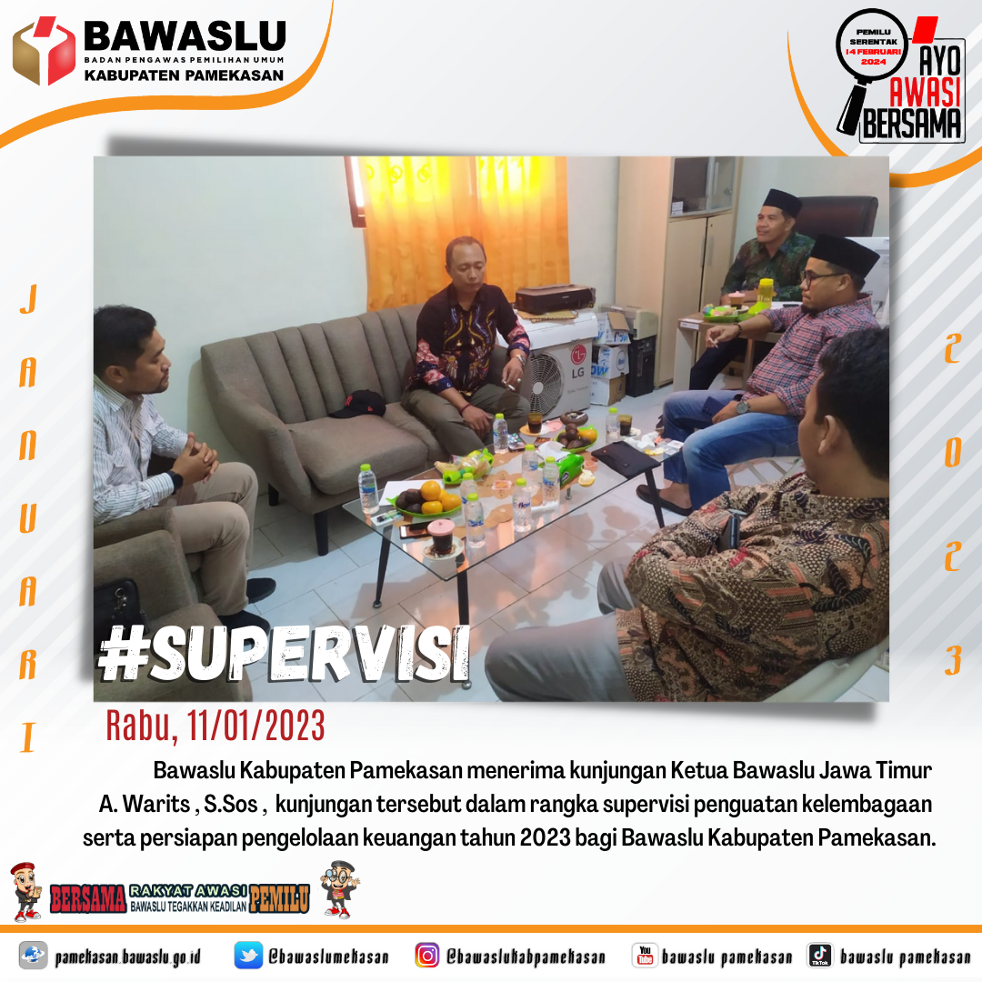 Badan Pengawas Pemilihan Umum Kabupaten Pamekasan - Pamekasan. Bawaslu Pamekasan menerima kunjungan Ketua Bawaslu Provinsi Jawa Timur, Bapak A. Warits. S.Sos beserta jajarannya pada hari Rabu, 11/01/2023. Kunjungan tersebut dalam rangka supervisi penguatan kelembagaan serta persiapan pengelolaan keuangan tahun 2023 bagi Bawaslu Kabupaten Pamekasan.