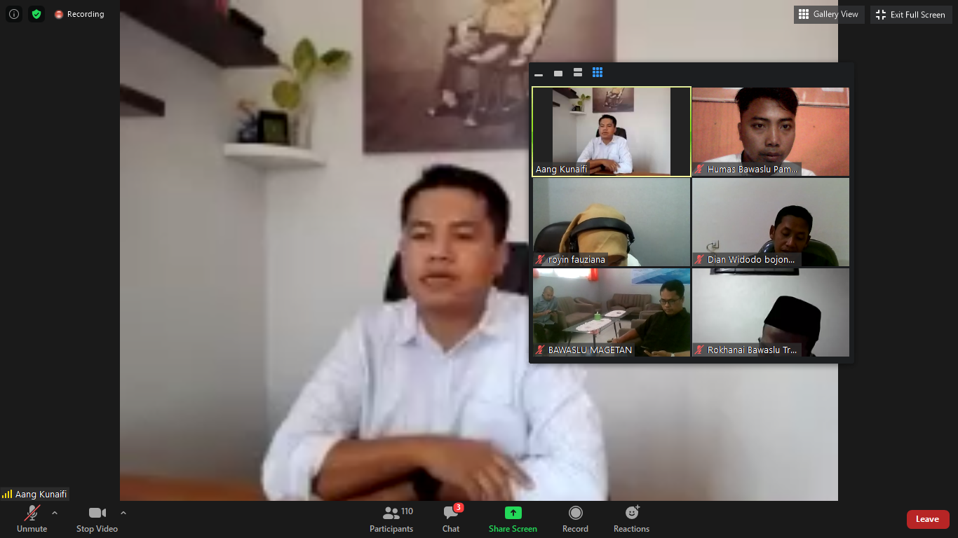 Aang Kunaifi, sebagai Koordinator Divisi Pengawasan Bawaslu Jawa Timur dalam pembukaan acara webinar tersebut menyampaikan bahwa, kerawanan dalam aspek politik uang ini masih cukup tinggi, lebih lagi hasil survey pada beberapa Lembaga yang dirilis kemaren di Jawa Pos ada 62 persen peserta memilih yang masih mau menerima praktek politik uang.