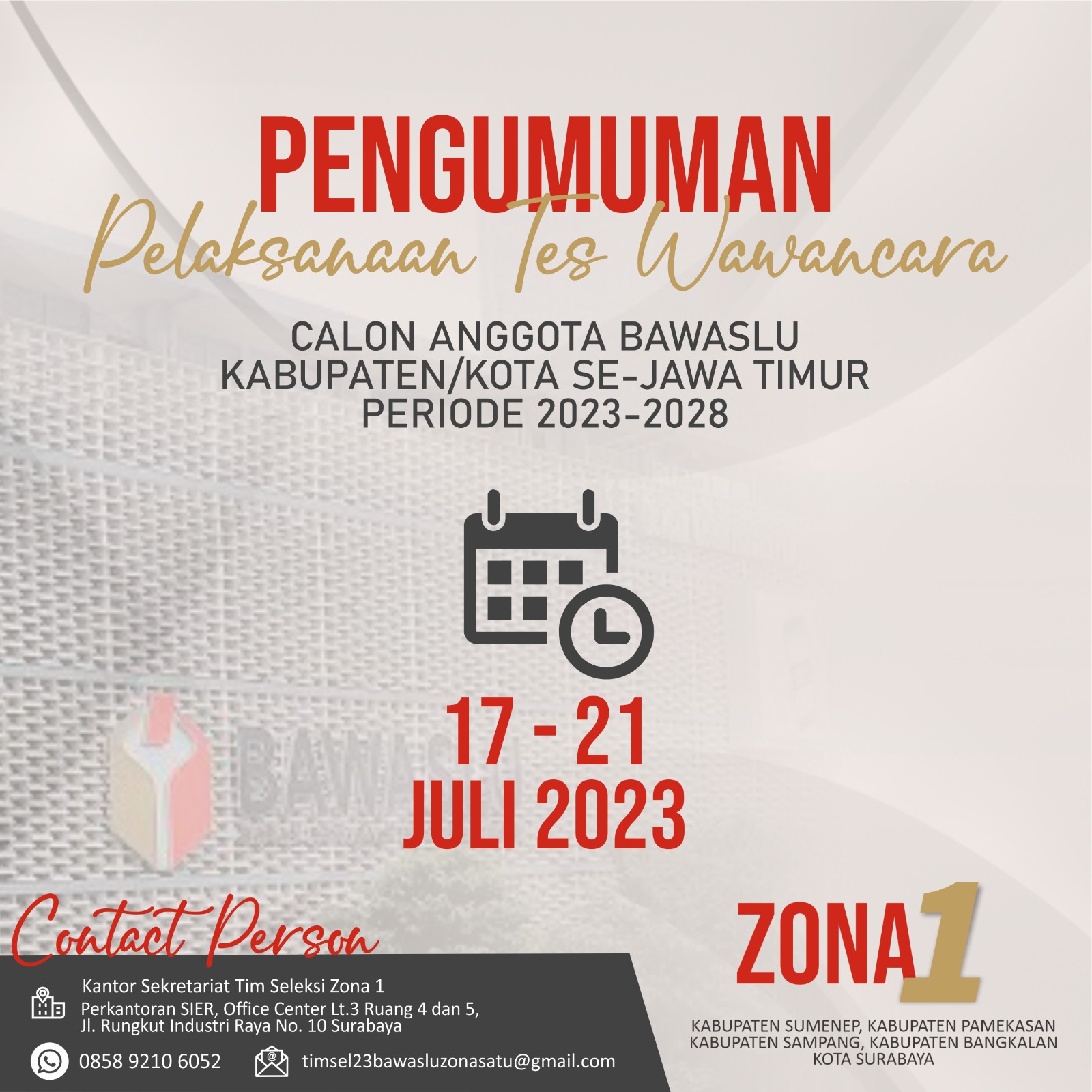 PENGUMUMAN PELAKSANAAN TES WAWANCARA CALON ANGGOTA BAWASLU KABUPATEN/KOTA SE-JAWA TIMUR ZONA 1 MASA JABATAN 2023-2028