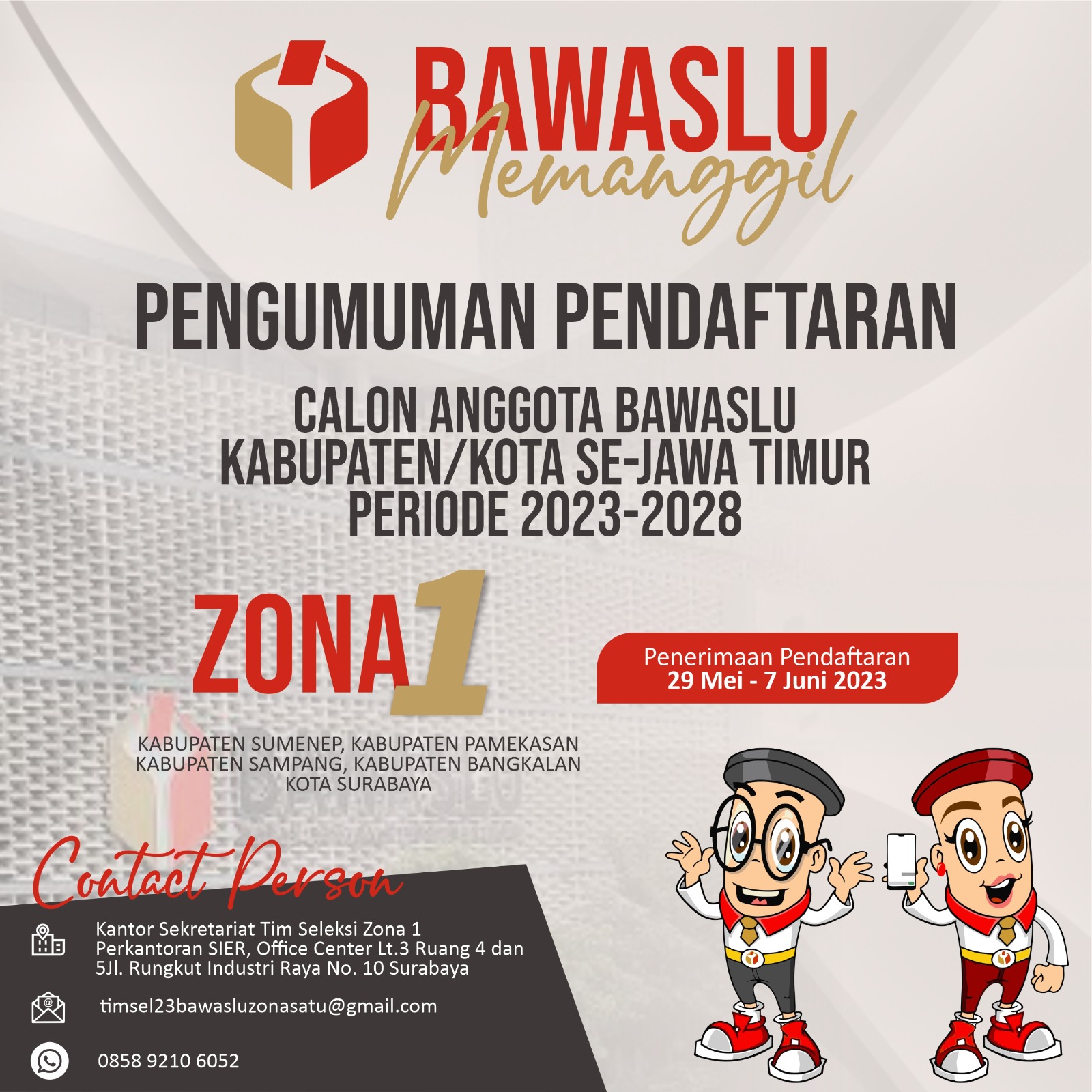 Dalam rangka pembentukan Bawaslu Kabupaten/Kota Provinsi Jawa Timur Zona 1 Tahun 2023, maka Tim Seleksi Calon Anggota Bawaslu Kabupaten/Kota Provinsi Jawa Timur Zona 1 berdasarkan Keputusan Bawaslu Nomor 176/HK.01.01/K1/05/2023 atas kewenangan yang diberikan oleh UndangUndang Nomor 7 Tahun 2017 tentang Pemilihan Umum membuka kesempatan bagi Warga Negara Indonesia yang memenuhi persyaratan untuk mendaftarkan diri sebagai calon anggota Bawaslu Kabupaten/Kota Provinsi Jawa Timur Tahun 2023.