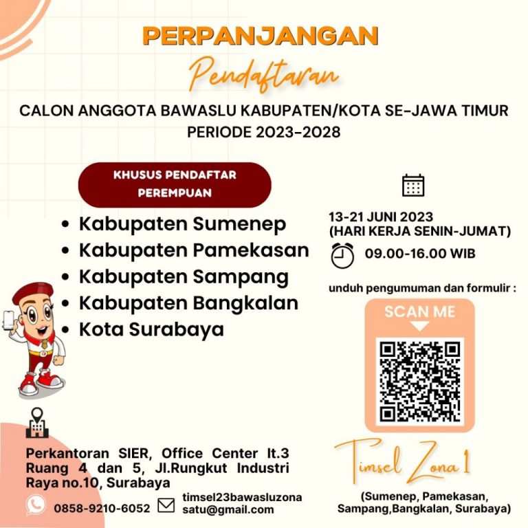 Berdasarkan Keputusan Ketua Bawaslu Nomor: 176/HK.01.01/K1/05/2023 atas kewenangan yang diberikan oleh Undang-Undang Nomor 7 Tahun 2017 tentang Pemilihan Umum, serta memperhatikan jumlah kebutuhan pendaftar dan keterwakilan pendaftar perempuan pada masing-masing Kabupaten/Kota di Provinsi Jawa Timur Zona 1 sebagaimana dimaksud pada Pedoman Pelaksanaan Pembentukan Bawaslu Kabupaten/Kota Masa Jabatan 2023-2028 pada bagian Perpanjangan Masa Pendaftaran, maka Tim Seleksi Calon Anggota Bawaslu Kabupaten/Kota Provinsi Jawa Timur Zona 1 memperpanjang masa pendaftaran di wilayah Kabupaten Bangkalan, Kabupaten Sampang, Kabupaten Pamekasan, Kabupaten Sumenep, dan Kota Surabaya khusus pendaftar Perempuan.