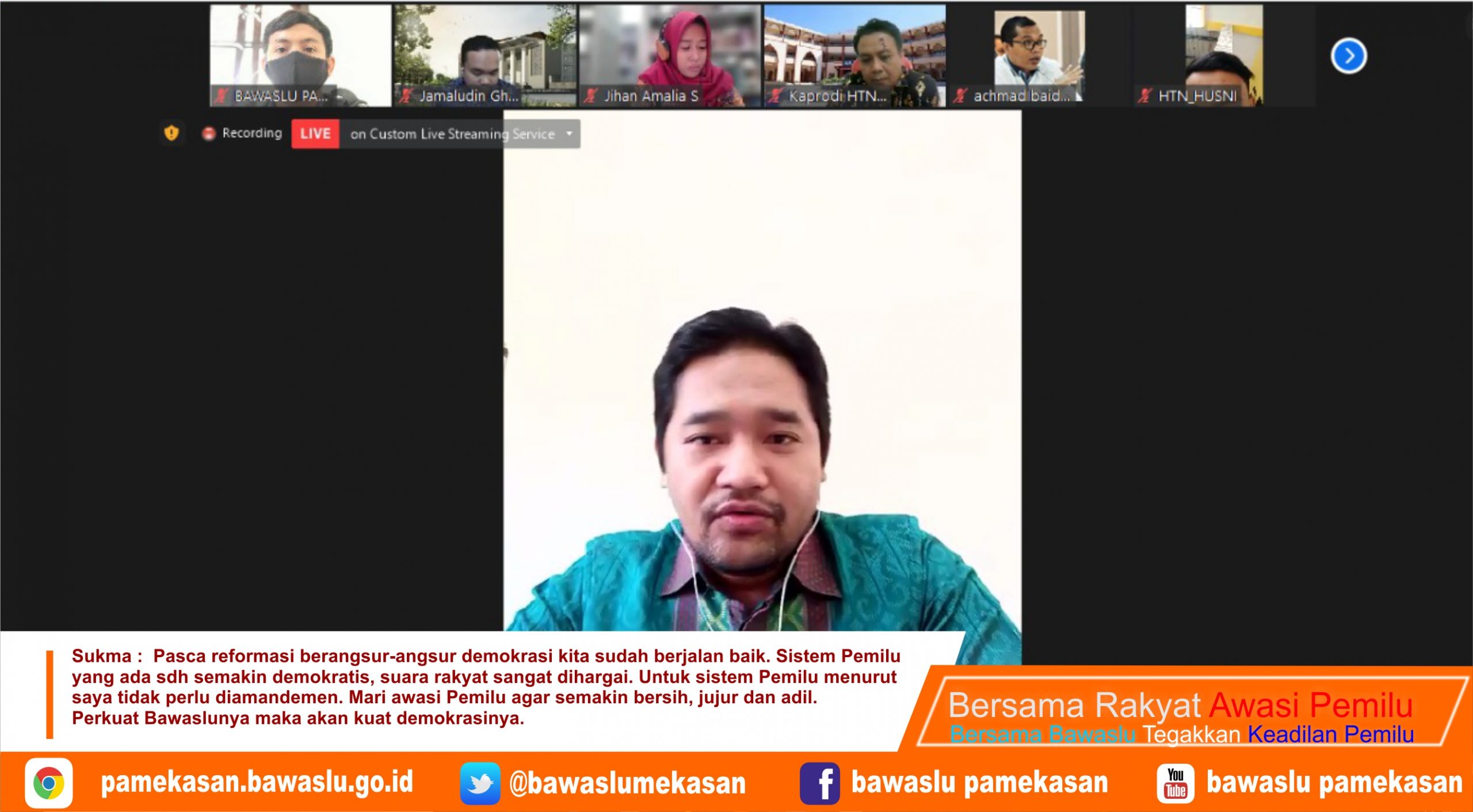 Bawaslu Pamekasan - Anggota Bawaslu Kabupaten Pamekasan Sukma Firdaus menjadi narasumber dalam kegiatan Kuliah Tamu Program Studi Hukum Tata Negara IAIN Madura pada Senin 4 Oktober 2021. Kegiatan yang dilakukan secara daring ini bertema "Wacana Amandemen Kelima UUD 1945; Antara Koreksi, Evaluasi atau Politisasi".