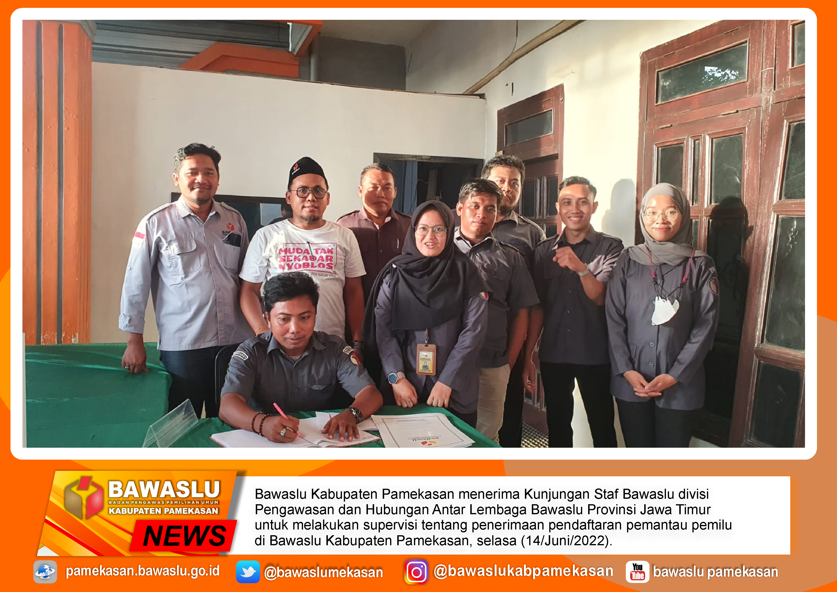 Pamekasan.bawaslu.go.id, Pamekasan, Badan Pengawas Pemilihan Umum Kabupaten Pamekasan menerima Kunjungan Staf Bawaslu divisi Pengawasan dan Hubungan Antar Lembaga Bawaslu Provinsi Jawa Timur untuk melakukan supervisi tentang penerimaan pendaftaran pemantau pemilu di Bawaslu Kabupaten Pamekasan, selasa (14/Juni/2022).