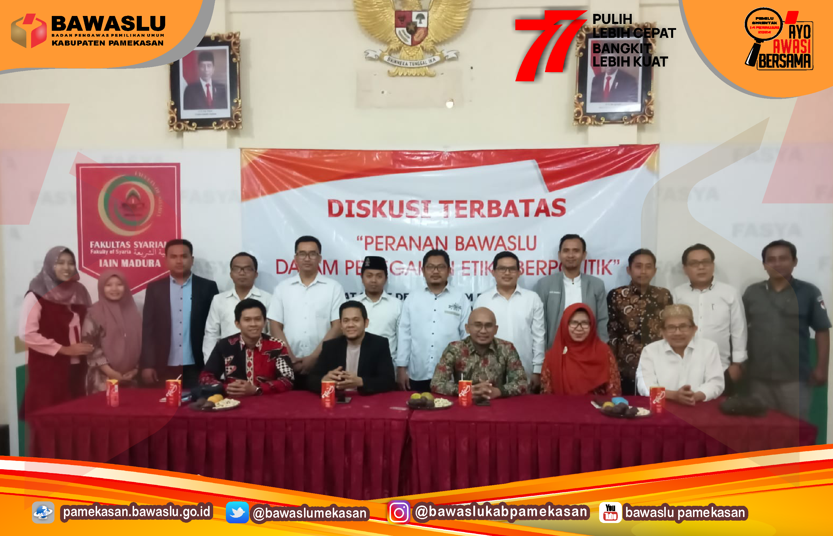 Pamekasan.bawaslu.go.id/ Anggota Bawaslu Pamekasan Bapak Suryadi (Koordinator Divisi Penyelesaian Sengketa) hadiri undangan sebagai pemateri dalam acara DISKUSI TERBATAS dengan tema “Peranan Bawaslu dalam Penegakan Etika Berpolitik” acara tersebut diselenggarakan oleh Pusat Studi Debat Hukum dan Konstitusi Fakultas Syariah IAIN Madura bersama Bawaslu Pamekasan. Selasa 30/08/2022.