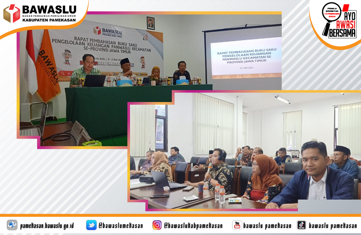 Badan Pengawas Pemilihan Umum Kabupaten Pamekasan - Anggota Bawaslu Kabupaten Pamekasan Sukma Firdaus, menghadiri Rapat Pembahasan Buku Saku Pengelolaan Keuangan Panwaslu Kecamatan Se-Provinsi Jawa Timur yang diadakan oleh Bawaslu Provinsi Jawa Timur di Kantor Bawaslu Kota Batu pada Tanggal 4 hingga 5 Mei 2023. Kegiatan tersebut dihadiri langsung oleh Ketua Bawaslu Provinsi Jawa Timur A. Warits dan satu orang Anggotanya Nur Elya Anggraini.