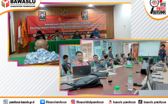 Badan Pengawas Pemilihan Umum Kabupaten Pamekasan- Koordinator Divisi Penanganan Pelanggaran dan Data Informasi Sukma Firdaus dan Staf menghadiri Sosialisasi Monitoring dan Evaluasi Keterbukaan Informasi Publik di Kantor Bawaslu Provinsi Jawa Timur pada Senin, (08/05/2023).