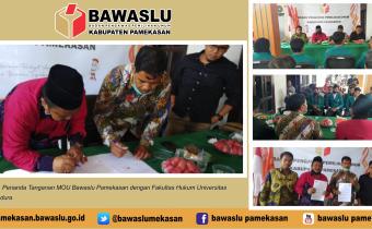 Bawaslu Pamekasan - Badan Pengawas Pemilihan Umum Kabupaten Pamekasan menandatangani perjanjian kerjasama dengan Universitas Islam Madura (UIM) Prodi Fakultas Hukum di Aula Kantor Bawaslu Kabupaten Pamekasan.